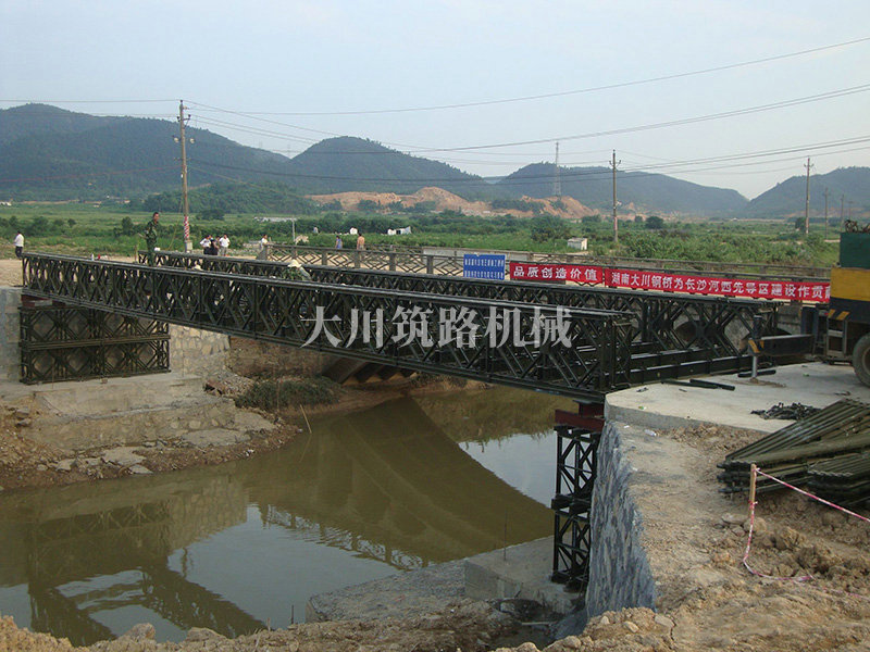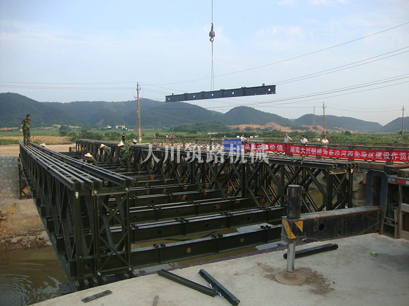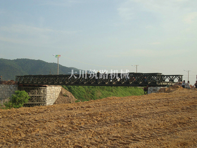 特點:本鋼橋由國防科技大學全程指導和監督安裝,滿足荷載80T施工車輛通行,因施工場地要求,采用貝雷梁組合式橋墩,安裝拆除方便,穩定性好。采用推出法安裝,安裝周期20天,于2011年5月25日通車。
